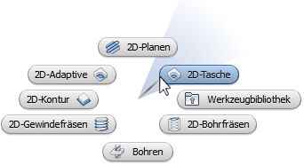 Wählen Sie zum Erstellen Ihrer ersten Bearbeitungsoperation einfach eine der Werkzeugwegstrategien aus dem CAM-Werkzeugkasten aus. Der Typ des erforderlichen Werkzeugwegs hängt natürlich von der Geometrie des Bauteils ab. Eine Beschreibung der einzelnen Bearbeitungsstrategien finden Sie unter den Inventor HSM-Hilfethemen Info über 2D-Bearbeitungsstrategien und Info über 3D-Bearbeitungsstrategien.