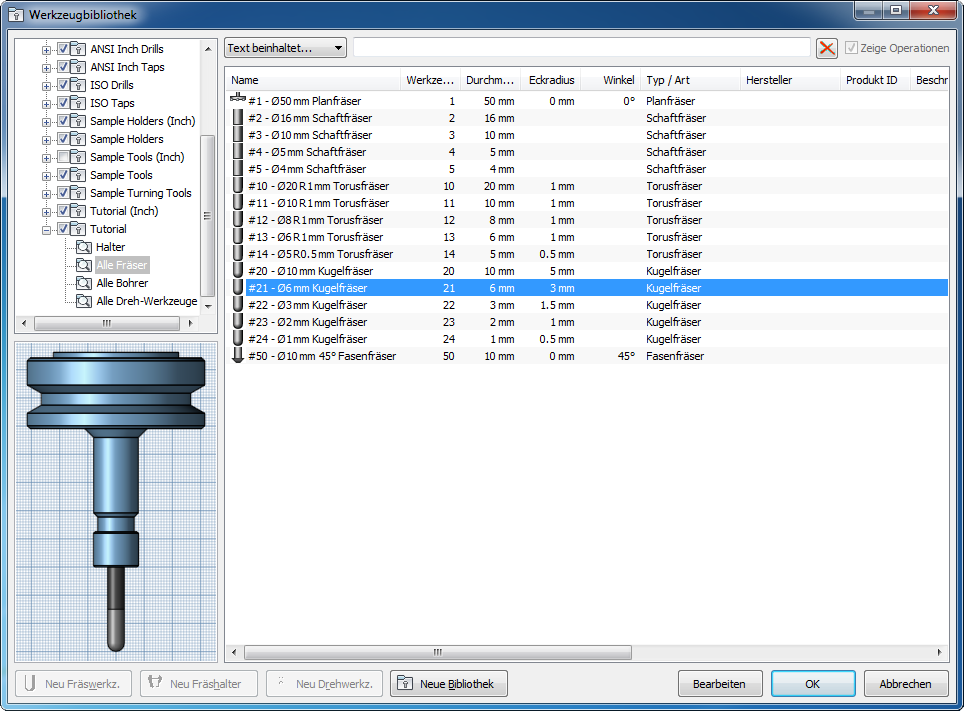 Ein Ø6-mm-Kugelfräser wird aus der Werkzeugbibliothek ausgewählt