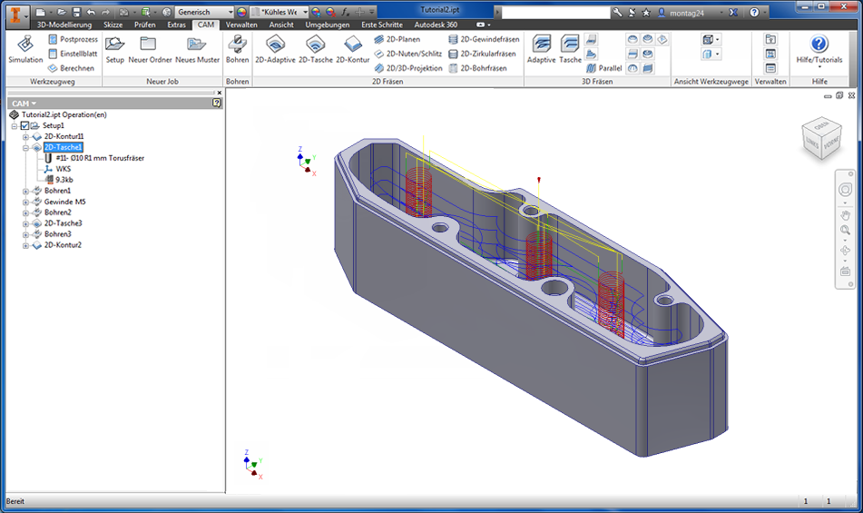 Das folgende Beispiel zeigt die Strategie 2D-Tasche, die dazu dient, die innere Kavität eines Bauteils auszuräumen.