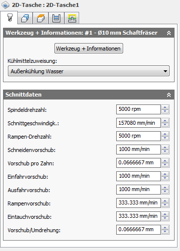 Das Dialogfeld Operation für die Strategie 2D-Tasche. Beachten Sie, dass die Registerkarte Werkzeug vorgabemäßig aktiv ist.