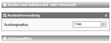 Der Abschnitt Rundungen und der Parameter Rundungsradius befinden sich auf der Registerkarte Strategieeinstellungen zwischen den Abschnitten Aufmaß und Glättungsfilter.