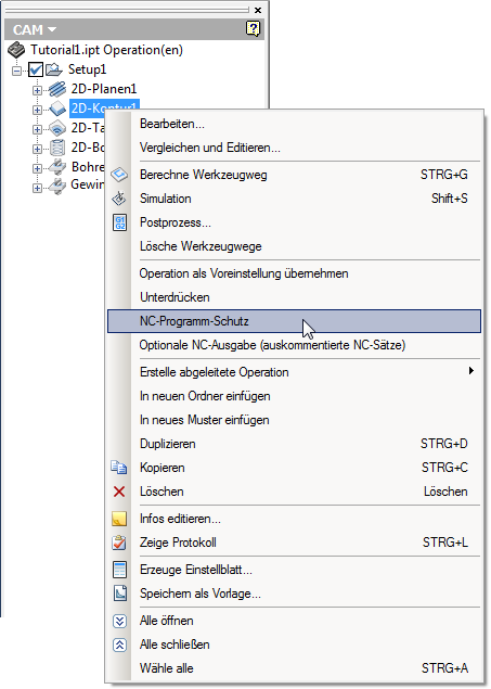 Um eine Operation zu schützen, klicken Sie im CAM-Browser mit der rechten Maustaste auf die Operation und wählen Schützen aus dem Kontextmenü. Entsprechend können Sie erneut Schützen wählen, um den Schutz aufzuheben. Sobald die Operation ungeschützt ist, wird sie automatisch als ungültig gekennzeichnet und muss neu berechnet werden.