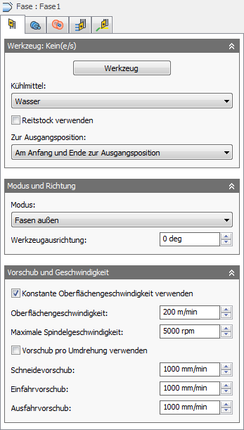 Aktivieren Sie diese Option, um die Spindelgeschwindigkeit automatisch anzupassen, sodass die Oberflächengeschwindigkeit zwischen dem Werkzeug und dem Werkstück beim Ändern des Schneidedurchmessers konstant bleibt. Konstante Oberflächengeschwindigkeit wird auf den meisten Maschinen mit G96 angegeben.