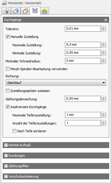 Der Maximalwert für die Glättung bei Schruppvorgängen. Verwenden Sie diesen Parameter, um scharfe Ecken im Werkzeugweg zu vermeiden.