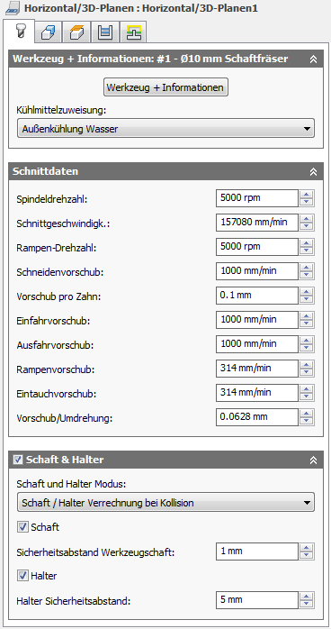 Bei Verwendung eines Werkzeugs mit Halter können Sie, je nach der Bearbeitungsstrategie, zwischen fünf verschiedenen Schaft/Halter-Modi wählen. Kollisionsbehandlung kann sowohl für den Schaft als auch den Halter des Werkzeugs erfolgen, und es können jeweils eigene Sicherheitsabstände eingestellt werden.