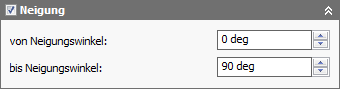 Die Neigungswinkelbegrenzung wird durch Einstellen der Parameter Von Neigungswinkel und Bis Neigungswinkel angegeben, die sich auf der Registerkarte Geometrie im Abschnitt Neigung befinden.