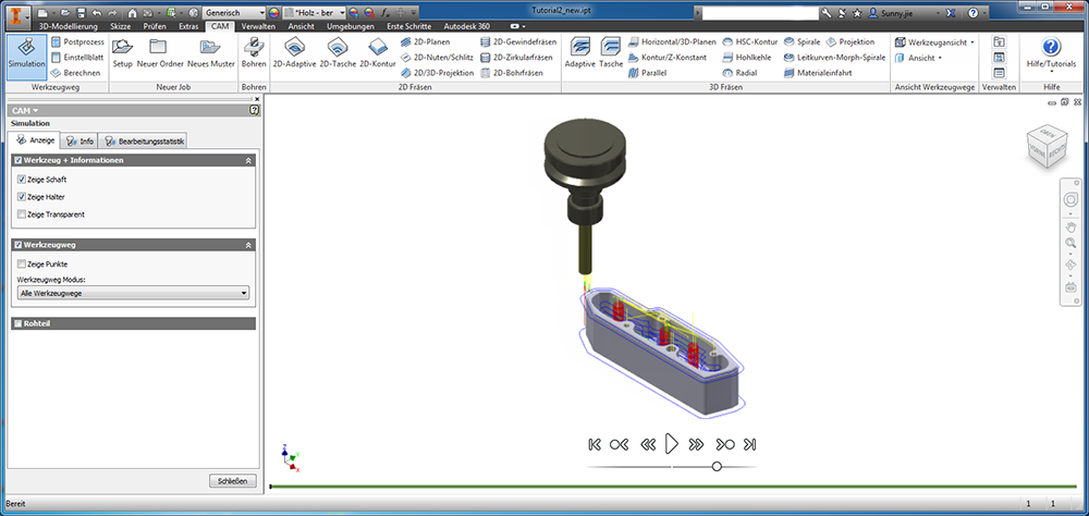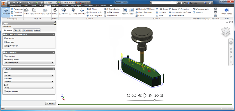 Nach dem Erstellen des Werkzeugwegs können Sie das Ergebnis mit dem integrierten Werkzeug Simulieren überprüfen. Über die Funktion Start wird die Bewegung des Werkzeugs simuliert. Die Steuerungsmöglichkeiten beinhalten Simulationsgeschwindigkeit und -richtung, Sichtbarkeit des Werkzeugs, Schafts und Halters sowie farbliche Darstellung von Eilgangbewegungen, Ein-/Ausfahrbewegungen und Schnittbewegungen.