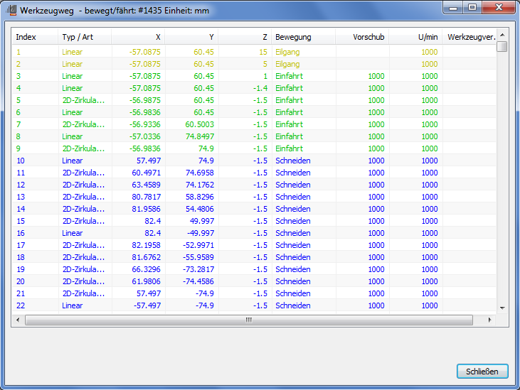 Das Dialogfeld Werkzeugweg anzeigen zeigt Informationen über einzelne Bewegungen wie Vorschübe und Geschwindigkeiten, Bewegungstypen, Werkzeugkompensation und Bewegungskoordinaten an.