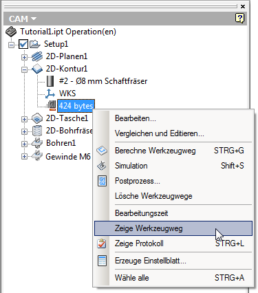 Werkzeugweg anzeigen bietet allgemeine Informationen zum Werkzeugweg in einem Listenformat. Dies kann in einigen Fällen praktischer sein als den Werkzeugweg tatsächlich zu simulieren. Sie können das Dialogfeld aus dem CAM-Browser aufrufen, indem Sie mit der rechten Maustaste auf die Werkzeugwegkomponente einer Operation klicken und Werkzeugweg anzeigen aus dem Kontextmenü wählen.