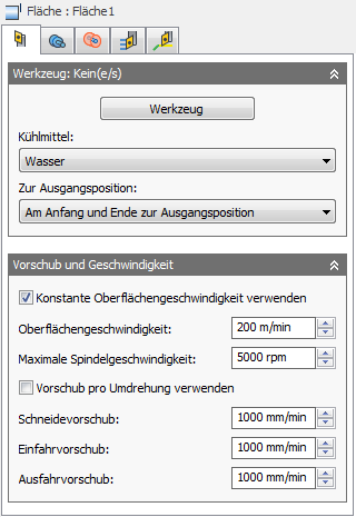 Aktivieren Sie diese Option, um die Spindelgeschwindigkeit automatisch anzupassen, sodass die Oberflächengeschwindigkeit zwischen dem Werkzeug und dem Werkstück beim Ändern des Schneidedurchmessers konstant bleibt. Konstante Oberflächengeschwindigkeit wird auf den meisten Maschinen mit G96 angegeben.