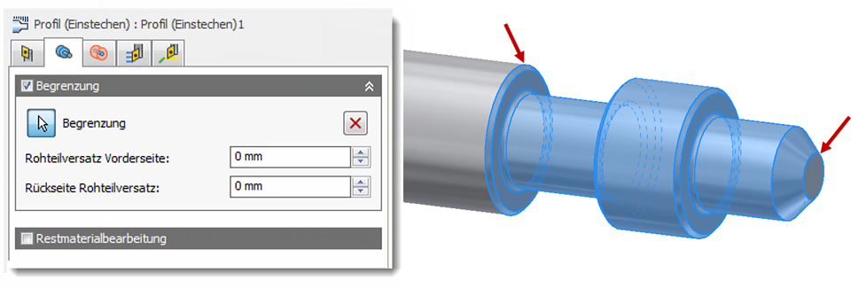 Mit den Parametern Rohteilversatz Vorderseite und Rückseite Rohteilversatz kann der Werkzeugweg über den Begrenzungsbereich hinaus erweitert oder innerhalb des Bereichs weiter begrenzt werden.