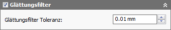 Derzeit gibt es nur zwei Einstellungen zum Steuern des Glättungsfilters. Sie können den Glättungsfilter aktivieren/deaktivieren, und Sie können die verwendete Toleranz festlegen. Der Glättungsfilter ist vorgabemäßig immer deaktiviert. Die Gesamttoleranz einer Operation ergibt sich aus der Bearbeitungstoleranz plus der Glättungstoleranz bei aktiviertem Glättungsfilter. Die Vorgabetoleranz wird von der Bearbeitungsstrategie und -toleranz abgeleitet. Bei Schlichtoperationen bewegt sich die Filtertoleranz normalerweise im Bereich von 50 % bis 200 % der angegebenen Bearbeitungstoleranz, wobei 100 % zu einem guten Ergebnis führen sollte. Bei Schruppoperationen bewegt sich die Filtertoleranz normalerweise im Bereich von 5 % bis 20 %, wobei 10 % zu guten Ergebnissen führen sollte.