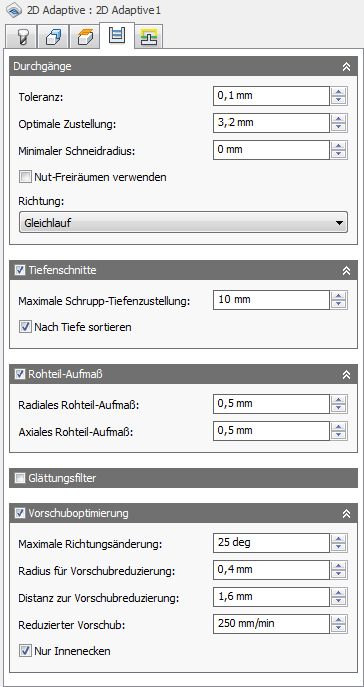 Glättet den Werkzeugweg, indem überschüssige Punkte entfernt und Bogen innerhalb der definierten Filtertoleranz angepasst werden.