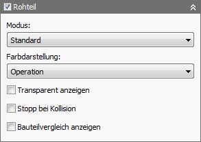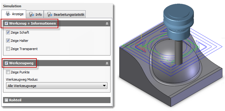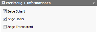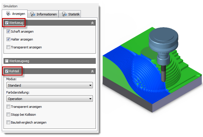 Über die Gruppe Werkzeug können Sie die Sichtbarkeit des Werkzeugschafts und Werkzeughalters während der Simulation ein- und ausschalten. Sie können diese Objekte auch transparent anzeigen lassen, sodass Sie durch sie hindurchsehen können.