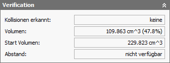 Die Gruppe Überprüfung zeigt, sofern vorhanden, die Anzahl der Kollisionen zwischen dem Schaft und/oder Halter und dem Werkstück an. Sie dokumentiert außerdem das Anfangsvolumen. Dies ist das Gesamtvolumen des ursprünglichen Rohteils. Der in der Simulation entfernte Rohteilbetrag wird durch den Wert Volumen dokumentiert.