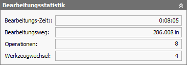 Die Gruppe Bearbeitungsstatistik enthält Informationen über den gesamten simulierten Werkzeugweg. Als aktuelle Informationen werden die gesamte Bearbeitungszeit, der gesamte Bearbeitungsweg, die Anzahl der durchgeführten Operationen und die Anzahl der Werkzeugwechsel angezeigt. Beachten Sie, dass die Bearbeitungszeit nur eine grobe Schätzung darstellt, die erheblich von der tatsächlichen Bearbeitungszeit nach dem Postprozessing abweichen kann.