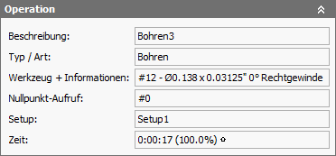 Die Gruppe Operation zeigt operationsspezifische Informationen für die Strategie an, wie z. B. die aktuelle Werkzeugposition oder die hervorgehobene Position. Zusätzlich werden die im Dialogfeld Operation für die Strategie angegebene nummerierte Operationsbeschreibung und das aktive Werkzeug angezeigt.