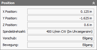 Die Gruppe Position enthält Informationen über die aktuelle Werkzeugposition. Diese Informationen umfassen die aktuelle Position, die Spindeldrehzahl, den Vorschub und die Bewegung. Im Nicht-Animationsmodus beziehen sich die Informationen auf die aktuell hervorgehobene Position, sofern aktiv, und andernfalls auf die aktuelle Werkzeugposition. Im Animationsmodus wird dagegen immer die aktuelle Werkzeugposition angezeigt.