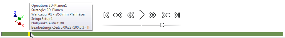 Direkt unter der Simulationswiedergabe am unteren Rand des Grafikfensters befindet sich die Zeitachse der Simulationswiedergabe. Diese Steuerung stellt bezogen auf die Werkzeugweglänge eine "Zeitachse" der gesamten Simulation bereit.