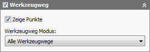Die Gruppe Werkzeugweg enthält verschiedene Optionen zum Steuern der Visualisierung des Werkzeugwegs. Über die verfügbaren Optionen können Sie während der Animation den gesamten Werkzeugweg, den Werkzeugweg vor oder nach der aktuellen Werkzeugposition, den Werkzeugweg für die Operation oder die Werkzeugwegstrecke bis zur aktuellen Werkzeugposition anzeigen lassen.