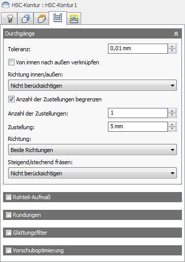Glättet den Werkzeugweg, indem überschüssige Punkte entfernt und Bogen innerhalb der definierten Filtertoleranz angepasst werden.