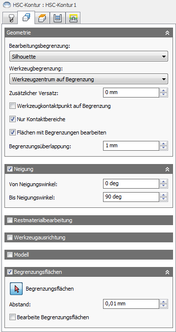 Um sicherzustellen, dass der Werkzeugrand die Begrenzung nicht berührt, wählen Sie die Werkzeugbegrenzungsmethode Innen und geben einen niedrigen positiven Wert an.