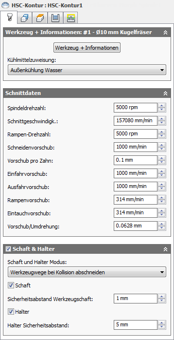 Bei Verwendung eines Werkzeugs mit Halter können Sie, je nach der Bearbeitungsstrategie, zwischen fünf verschiedenen Schaft/Halter-Modi wählen. Kollisionsbehandlung kann sowohl für den Schaft als auch den Halter des Werkzeugs erfolgen, und es können jeweils eigene Sicherheitsabstände eingestellt werden.