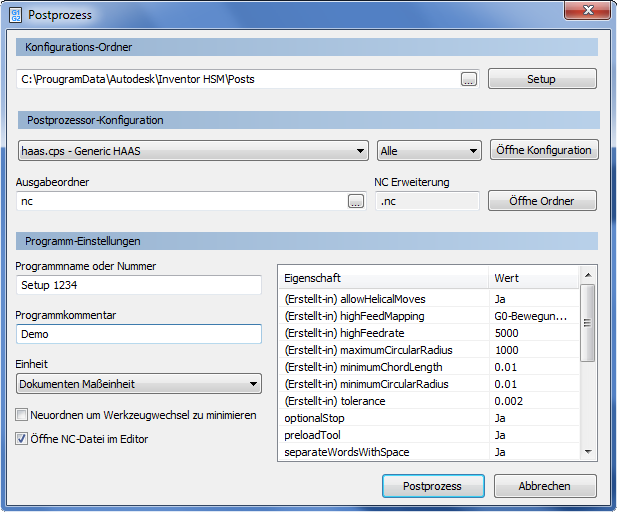 Wenn das Dialogfeld Postprozess das erste Mal geöffnet wird, durchsucht es den Ordner mit den Postprozessorkonfigurationen nach Vorgabeeigenschaften und stellt Ihnen alle funktionierenden Postprozessorkonfigurationen zur Verfügung.