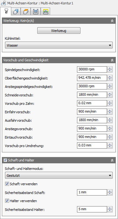 Bei Verwendung eines Werkzeugs mit Halter können Sie, je nach der Bearbeitungsstrategie, zwischen fünf verschiedenen Schaft/Halter-Modi wählen. Kollisionsbehandlung kann sowohl für den Schaft als auch den Halter des Werkzeugs erfolgen, und es können jeweils eigene Sicherheitsabstände eingestellt werden.