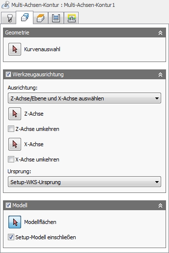 Die Strategie Multi-Achsen-Kontur dient zum Bearbeiten mit der Spitze des Werkzeugs entlang einer bestimmten Kontaktkurve. Vorgabemäßig bewegt sich das Werkzeug lotrecht zur Fläche. Zusätzliche Führungs-/Folge- und Seitwärtsneigungen können jedoch verwendet werden, um den Kontaktpunkt des Werkzeugs zu steuern. Die Strategie ermöglicht eine mittige, linke und rechte Kompensation.