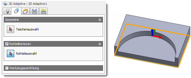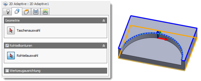 Anfänglich funktioniert 2D-Adaptive Clearing wie 2D-Tasche, und wenn Sie eine oder mehrere geschlossene Konturen auswählen, können Sie diese wie eine gewöhnliche Tasche bearbeiten. Wenn Sie jedoch auch eine Rohteilkontur auswählen, die die ausgewählten Konturen umschließt, bearbeitet 2D-Adaptive Clearing alle Bereiche von der Rohteilkontur bis zu den ausgewählten Konturen, beginnend von außen nach innen.