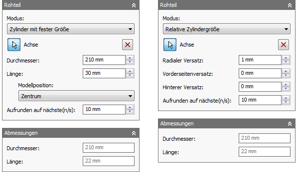 Zylinder mit fester Größe können Sie die Achse des zylindrischen Rohteils bestimmen. Sie können auch genaue Werte eingeben, um den Durchmesser und die Länge des Rohteils anzugeben. Das Dropdown-Menü