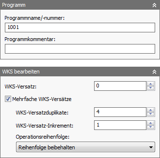 Wenn Sie Mehrfache WKS-Nullpunktverschiebungen aktivieren, können Sie die Gesamtanzahl der Exemplare und die zu verwendende inkrementale Nullpunktverschiebung angeben. Sie können auch die Sortierung der duplizierten Werkzeugwege auswählen (nach Setup, nach Operation oder nach Werkzeug).
