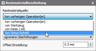 - Aktivieren Sie Restmaterialbearbeitung, und legen Sie Von Setup-Rohteil als Restmaterialquelle fest.