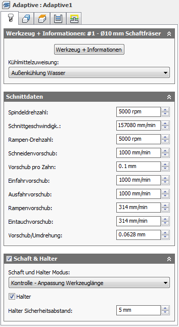 Bei Verwendung eines Werkzeugs mit Halter können Sie, je nach der Bearbeitungsstrategie, zwischen fünf verschiedenen Schaft/Halter-Modi wählen. Kollisionsbehandlung kann sowohl für den Schaft als auch den Halter des Werkzeugs erfolgen, und es können jeweils eigene Sicherheitsabstände eingestellt werden.