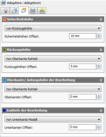 Mit der Rückzugshöhe wird die Höhe festgelegt, zu der das Werkzeug nach oben verschoben wird, bevor die nächste Schnittbewegung erfolgt. Der Wert für die Rückzugshöhe muss über dem Wert für Vorschubhöhe und Oberkante liegen. Die Rückzugshöhe wird zusammen mit dem nachfolgenden Versatz zum Festlegen der Höhe verwendet.