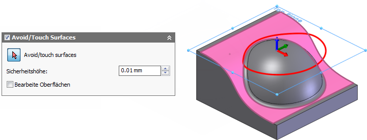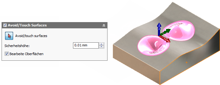 Sie können die Bedeutung der zu vermeidenden Fläche umkehren, indem Sie das Kontrollkästchen Flächen berühren aktivieren. Bei aktivierter Option müssen die zu vermeidenden Flächen innerhalb des gegebenen Sicherheitsabstands berührt werden. Die restlichen Oberflächen hingegen werden vermieden.