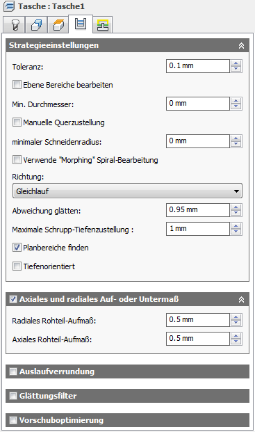 Der Maximalwert für die Glättung bei Schruppvorgängen. Verwenden Sie diesen Parameter, um scharfe Ecken im Werkzeugweg zu vermeiden.