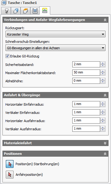 Mit der Rückzugshöhe wird die Höhe festgelegt, zu der das Werkzeug nach oben verschoben wird, bevor die nächste Schnittbewegung erfolgt. Der Wert für die Rückzugshöhe muss über dem Wert für Vorschubhöhe und Oberkante liegen. Die Rückzugshöhe wird zusammen mit dem nachfolgenden Versatz zum Festlegen der Höhe verwendet.