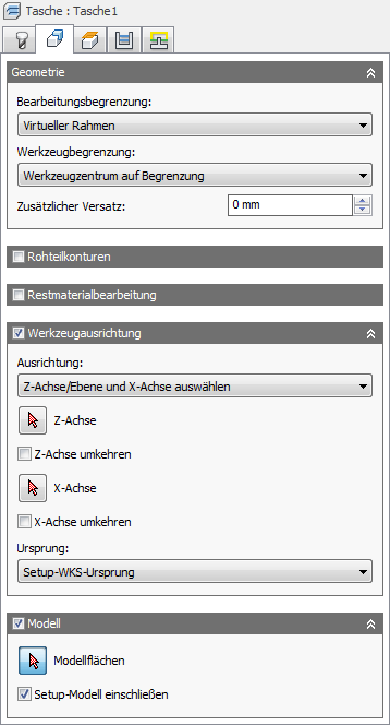 Diese vorgabemäßig aktivierte Option sorgt dafür, dass das im Setup ausgewählte Modell zusätzlich zu den in der Operation ausgewählten Modellflächen einbezogen wird. Wenn Sie dieses Kontrollkästchen deaktivieren, wird der Werkzeugweg nur für die in der Operation ausgewählten Flächen erzeugt.