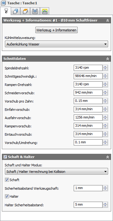 Bei Verwendung eines Werkzeugs mit Halter können Sie, je nach der Bearbeitungsstrategie, zwischen fünf verschiedenen Schaft/Halter-Modi wählen. Kollisionsbehandlung kann sowohl für den Schaft als auch den Halter des Werkzeugs erfolgen, und es können jeweils eigene Sicherheitsabstände eingestellt werden.