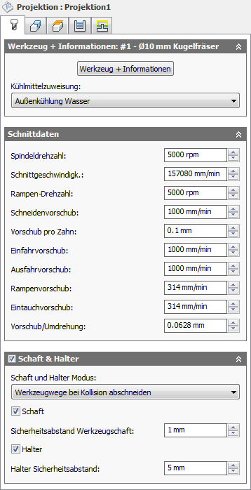 Bei Verwendung eines Werkzeugs mit Halter können Sie, je nach der Bearbeitungsstrategie, zwischen fünf verschiedenen Schaft/Halter-Modi wählen. Kollisionsbehandlung kann sowohl für den Schaft als auch den Halter des Werkzeugs erfolgen, und es können jeweils eigene Sicherheitsabstände eingestellt werden.