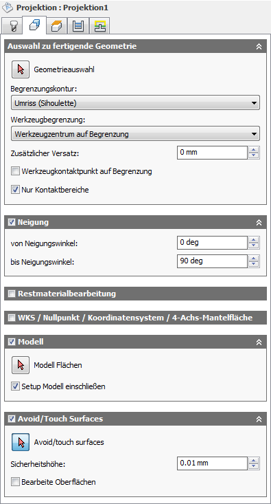 Es werden nur Bereiche bearbeitet, die größer oder gleich den Werten der Parameter Von Neigungswinkel und Bis Neigungswinkel sind.