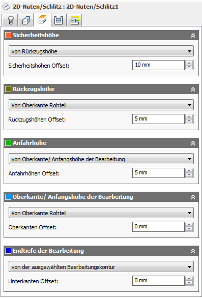 Mit der Rückzugshöhe wird die Höhe festgelegt, zu der das Werkzeug nach oben verschoben wird, bevor die nächste Schnittbewegung erfolgt. Der Wert für die Rückzugshöhe muss über dem Wert für Vorschubhöhe und Oberkante liegen. Die Rückzugshöhe wird zusammen mit dem nachfolgenden Versatz zum Festlegen der Höhe verwendet.
