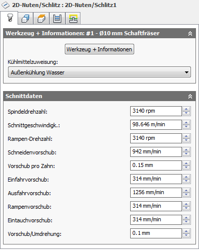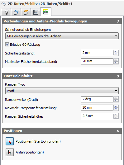 Die Strategie 2D-Nuten/Schlitz fräst Nuten, indem diese an ihren Kanten gewählt werden. Die Alternative ist die Verwendung von 2D-Kontur mit „Aus“-Kompensation zur Bearbeitung der Nuten. Die Geometrie ist jedoch häufig entlang der Mittellinie einer Nut nicht verfügbar. Es ist daher einfacher, die Strategie 2D-Nuten/Schlitz zu verwenden.