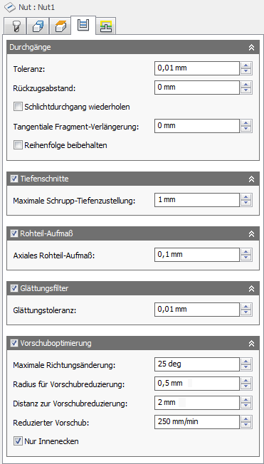 Glättet den Werkzeugweg, indem überschüssige Punkte entfernt und Bogen innerhalb der definierten Filtertoleranz angepasst werden.