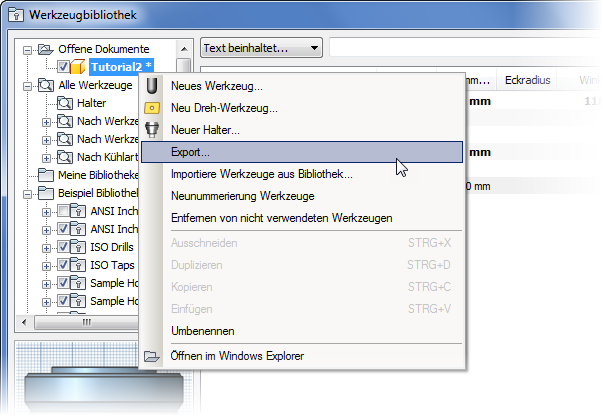 Mit Inventor HSM können Sie die Werkzeugtabellen aus offenen Dokumenten in reguläre Werkzeugbibliotheken exportieren. Dies kann sehr nützlich sein, wenn Sie eine Werkzeugtabelle für Ihre Maschine angelegt haben und diese in anderen Dokumenten wiederverwenden möchten.