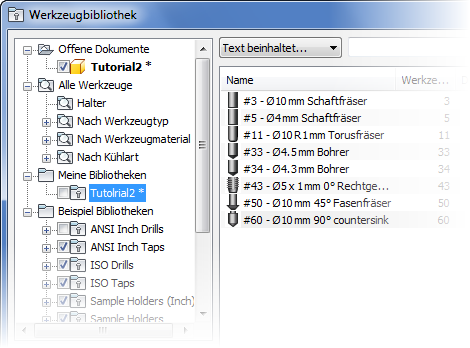 Anmerkung: Wenn Sie in einen anderen Ordner exportieren, wird die Bibliothek erst dann im Dialogfeld Werkzeugbibliothek sichtbar, wenn Sie diesen Ordner im Bibliotheks-Dialog hinzufügen. Sie können nach wie vor Werkzeuge aus der Bibliothek importieren, indem Sie die Option Importiere Werkzeuge aus Bibliothek verwenden.
