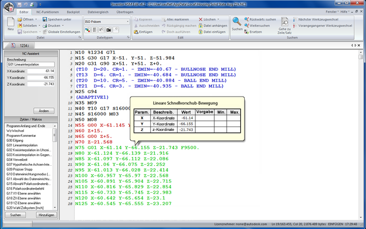 , um die CNC-Programmdatei zu generieren. Vorgabemäßig öffnet sich Inventor HSM Edit. Hier können Sie den Programmcode anzeigen, simulieren und an die Maschinensteuerung übertragen.