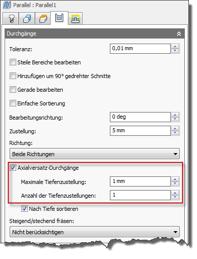 Axiale Offset-Durchgänge funktionieren ähnlich wie mehrfache Schichtzustellungen bei 2D-Operationen und eignen sich dazu, einen festen Betrag des Rohteils mittels mehrerer Durchgänge abzutragen. Wenn Sie beispielsweise ein Aufmaß von 1 mm haben, können Sie dieses in fünf Durchgängen von je 0,2 mm mit parallelem Schlichten abtragen.